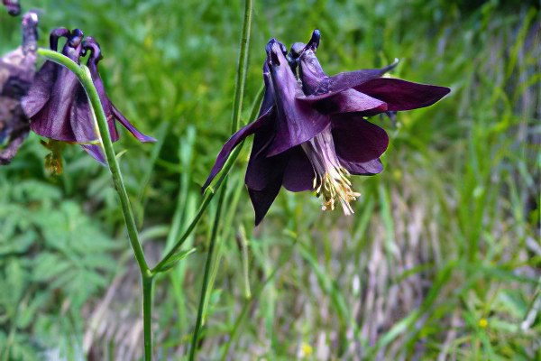 - Темная аквилегия. Максимальная высота стебля составляет 0,8 м. Листья имеют сизый оттенок, а цветы – темно-лиловый. Цветки достигают 4 см в диаметре, шпорцы короткие и загнутые, а тычинки хорошо видны. Цветение начинается рано, и первые цветы можно увидеть уже в конце весны. Растение предпочитает полутень и благодаря своему насыщенному цвету часто используется в цветочных композициях.