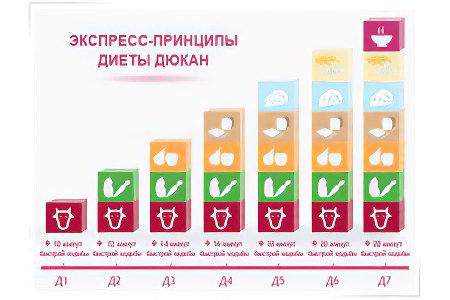| Этап диеты Дюкана («Лестница») | Разрешенные продукты | Ограничения и рекомендации |