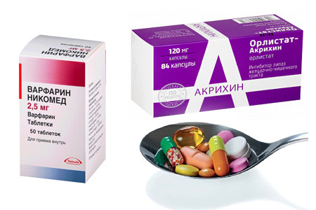 Орлистат — средство для похудения. Его активные вещества снижают усвоение жиров из пищи, что уменьшает всасывание жирорастворимых витаминов, включая витамин К. При сочетании Орлистата с Варфарином наблюдается увеличение протромбинового времени [17].