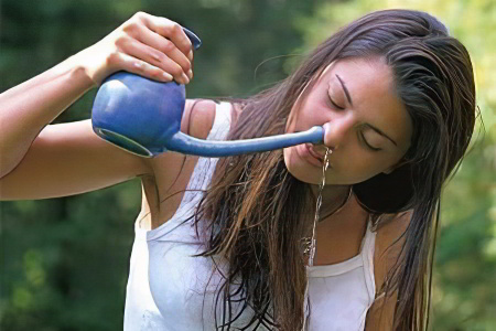 Промывание носа выполняется следующим образом: наклоните корпус вперёд, сохраняя спину и колени прямыми. Поверните корпус вправо на 50 градусов, поднимите голову и налейте воду в правую ноздрю, чтобы она вытекала из левой. Если из-за заложенности носа вам не удастся сразу выполнить все действия, проявите настойчивость — у вас всё получится. Затем повторите процедуру для левой ноздри и сделайте это дважды.