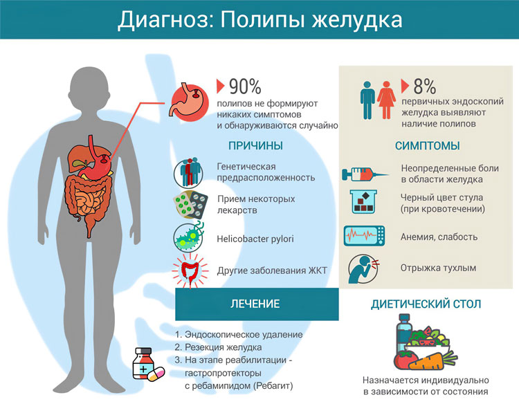 | Боль в животе, дискомфорт в желудке | Желудочные полипы (особенно большие или воспаленные) | Обращение к гастроэнтерологу для диагностики (эндоскопия с биопсией) |
