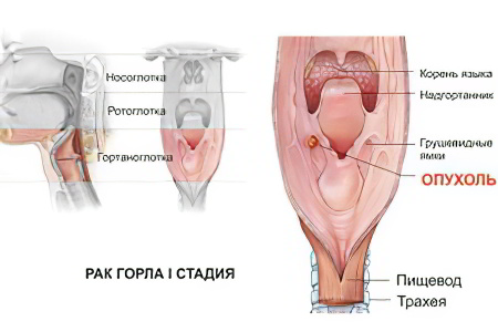 Первые симптомы связаны с локализацией рака горла. Определив место расположения опухоли, можно понять, какая часть органа поражена: верхняя, средняя или нижняя.