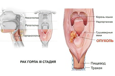 На третьей стадии необходимо обратить внимание на степень распространения опухолевых клеток в надгортанной области, с возможным вовлечением голосовой щели и подглоточной зоны: