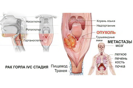 Четвертая стадия рака горла делится на три подкатегории: IVА, IVВ и IVС. Эти подкатегории различаются по специфике локализации. В основном, рак затрагивает гортань, особенно её верхнюю часть.