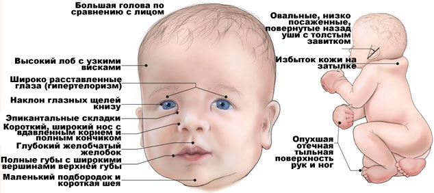 - Глазной гипертелоризм: глаза расположены широко, часто наблюдается птоз верхнего века, разрез глаз имеет антимонголоидную форму, уши расположены низко.